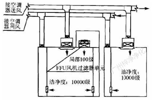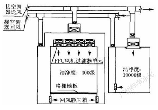 此方式的缺點(diǎn)是設(shè)置循環(huán)風(fēng)機(jī)箱及處理噪聲,需要較大的空間,而通常百級(jí)區(qū)周?chē)L(fēng)管都比較密集,需要精心布局。此方式百級(jí)區(qū)上部靜 壓箱相對(duì)百級(jí)區(qū)室內(nèi)為正壓,頂棚高效過(guò)濾器與吊架間的滲漏,為靜壓箱流向室內(nèi),直接影響百級(jí)區(qū)潔凈度。對(duì)施工質(zhì)量要求較高。(具 體可參考: