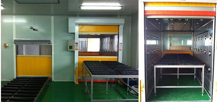4、快速卷簾門流水線貨淋室(自動感應控制快速卷簾門),流水線可做成整體一條線,門下降時接近流水線,也可將流水線分成三部分;貨淋室和風淋室定制作流水線主要有兩種形式