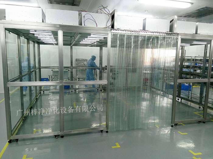 潔凈棚它主要從FFU頂部將空氣吸入,經(jīng)初效過濾器,高效過濾器過濾,過濾后的潔凈空氣在整個(gè)出風(fēng)面以0.45m/s±20%的風(fēng)速勻速送出到潔凈棚內(nèi)。形成均流層,使?jié)崈艨諝鈿饬鞒蚀怪眴蜗蛄?,從而保證了工作區(qū)內(nèi)所要求的潔凈度。潔凈棚等級通常分為百級潔凈棚,千級潔凈棚,萬級潔凈棚。